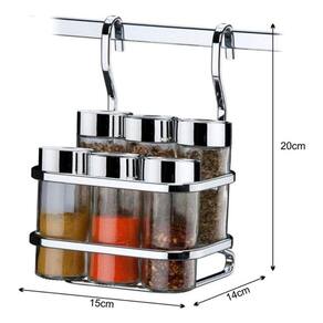 Características: - Dimensões do Suporte c/ os Porta Temperos: 14,5cm (Largura) x 19,5cm (Altura) x 14,5cm (Profundidade) - Dimensões do Porta Tempero: 4cm (Diâmetro) x 10cm (Altura) - Peso Total: 1,058kg - Conteúdo da embalagem: 1 Suporte aço cromado + 6 Frascos de vidro + 6 Tampas plásticas - Possui Tecnologia Rust Free: Resistente ao ferrugem, aos raios UV e à umidade