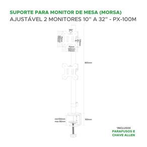 O suporte ajustável de mesa PIX PX-100M é ideal para organizar seu espaço de trabalho, oferecendo suporte seguro e eficiente para dois monitores de tamanhos entre 10 e 32 polegadas. Projetado para monitores LED ou LCD, ele proporciona maior conforto visual e ergonomia, ajustando-se às suas necessidades com opções de articulação e inclinação. Com capacidade para até 8 kg por monitor e padrão VESA, este suporte é uma solução prática e durável, acompanhada de 5 anos de e um kit completo com parafusos e chave allen para fácil instalação. Especificações Técnicas: - Modelo: PX-100M - Compatibilidade: monitores LED ou LCD de 10 a 32 polegadas - Capacidade: suporta até 8 kg por monitor - Ajustes: - Articulação de 180 graus - Inclinação de 90 graus - Fixação: padrão VESA - Itens inclusos: - Parafusos M4 x 12 mm, M5 x 16 mm, M4 x 30 mm, M6 x 12 mm - Chave allen para instalação - : 5 anos - Conteúdo da embalagem: 1 unidade do suporte ajustável de mesa Marca: Não Informado