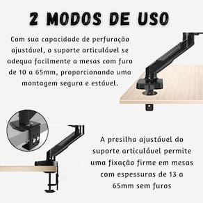 este suporte articulável oferece versatilidade sem igual. Sua presilha ajustável assegura uma fixação firme em mesas com espessuras de 13 a 65mm, tudo sem necessidade de furos. E também tem opção de perfuração ajustável para mesas de 10 a 65mm, a montagem é segura e estável, adaptando-se perfeitamente às suas necessidades.