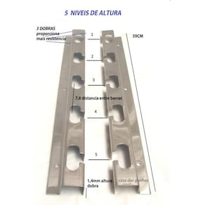 Suporte para grelha e espetos para churrasqueiras até 60cm largura com 6 tubos alumínio Descrição Contém: 4 suportes 100% inox 430 de 39cm; 6 barras de tubo de alumínio comprimento de 60cm e 12mm diâmetro aguenta até 10K; Acompanha buchas e parafusos. Observação: - Atende churrasqueira até 60cm largura os suportes não compensarão o tamanho se a churrasqueira for maior confira as medidas de sua churrasqueira antes de comprar pois se for 61cm a barra poderá ficar caindo O kit de suporte serve para apoio de grelhas e espetos, pode ser instalado em churrasqueiras de alvenaria, gourmet com parede , tijolinhos . As barras podem ser serradas se a churrasqueira for menor na largura com uma serrinha manual. Características do produto: - possui 5 níveis de altura - Suporte com 3 dobras - para dar maior sustentação e chapa 0,70mm - Barra de 1/2 polegadas - Tem alta resistência a corrosão por sem em inox - Fácil limpeza, por ser inox polido - Excelente acabamento e designe, deixe sua churrasqueira moderna - Fácil instalação - utilidade em churrasqueiras de alvenaria, gourmet e pré-moldada Instalação: Produto de fácil instalação, você mesmo instala com uma furadeira e broca de 6mm e auxílio de uma trena. Retirar primeiramente a película branca ou azul dos dois lados dos suportes. As barras podem ser cortadas Sim podem ser serradas pelo próprio comprador com uma serrinha manual em caso de a churrasqueira ser menor que 60cm. Fabricação: Plenitude Industria - Pleno Industria Fotos ilustrativas, não acompanha grelha Marca: Não Informado Ean: 0606529273965