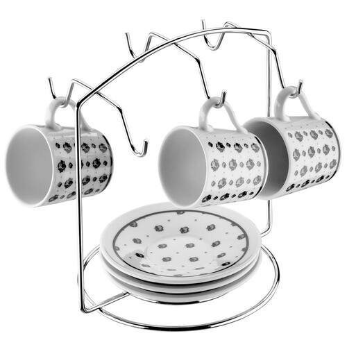 Garantia: 3 meses / Peso: 170g / Cor: Preto fosco / Ref: 152991 Dimensões: 21cm (C) x 14,5cm (L) x 23cm (A). Espaçamento entre as hastes para xícara: 6,5cm. Área de uso: 16,5cm (C) x 13,5cm (L) x 14,5cm (A) Distância dos pires até nas xícaras: 14,5cm. * Não acompanha as xícaras e pires. Conteúdo: 01 suporte.