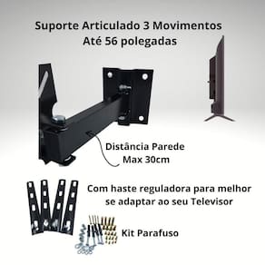 Suporte articulado 3 movimentos para tv p725 smart led 55 4k O suporte articulado é ideal pra poupar espaço no local e é importante não só para a decoração do ambiente, como também para dar mais flexibilidade para a tv. Ideal para fixar seu aparelho de maneira fácil, eficaz e segura, em qualquer ambiente de sua casa ou estabelecimento. Ele possui diversas aplicações, é um suporte multiuso três em um, pode ser utilizado na parede, no teto ou na mesa, conta com duas articulações horizontais e uma inclinação vertical, totalizando três movimentos, assim a tv pode ficar com ângulos diferentes. Compatível com tvs de 10 a 56 polegadas para teto, até 40 polegadas , led, plasma, lcd, oled e qled Compatibilidade furação: padrão vesa 50x50mm, 75x75mm, 100x75mm, 100x100mm, 200x100mm, 200x200mm, 400x200mm e 400x400mm Distância mínima da parede até a televisão: 9cm Distância máxima da parede até a televisão: 30cm Inclinação máxima: 15 graus Peso máximo suportado: 40kg O kit de parafusos contém os tamanhos mais usados entre as diversas marcas e modelos de tv. Utilize somente os que forem compatíveis com sua televisão, guarde os outros para usar em outro momento. Em casos raros, esses parafusos podem não se encaixar corretamente, se isso ocorrer é só providenciar parafusos adequados a sua tv. Garantia: 3 anos por conta do fabricante Dimensões embalagem cm : a 6,5 x l 14,5 x c 34 Peso bruto: 1,750kg