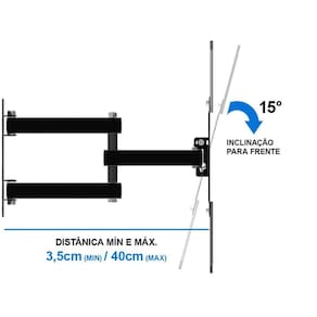 Suporte Articulado De Parede Para Monitor E Tv - Bluecase Local para a instalação: Parede Ajuste de Altura: Não ajustável Distância máxima do braço estendido: 40cm Peso máximo suportado(KG): até 22 kg Tamanho TV/Monitor compatível: 32 55 Cor: Preto Fabricação: Aço carbono Giro Horizontal: 90 Inclinação Horizontal: Duas articulações, cada uma com até 180 (Limitado até 75 de acordo com o tamanho do televisor). Inclinação Vertical: 15 para a frente Padrão VESA: 75x75mm, 100x100mm, 200x200mm, 300x300mm e 400x400mm Pintura: Eletrostática Tipo: Tri-Articulado Conteúdo da embalagem: Um suporte tri-articulado, nivelador, kit de instalação e manual de instruções