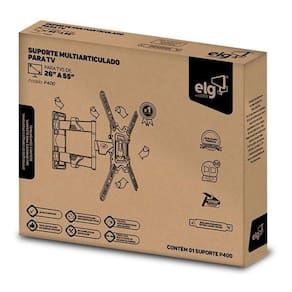 O suporte multiarticulado de parede P400 ELG é indicado para TVS de 26 a 55, telas planas ou curvas, com peso até 35 Kg e padrão de fixação VESA 400.