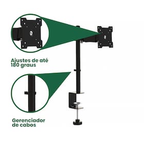 NCM: 73269090 Tipo: Inclinação e Rotação Polegadas: 13" a 27" Inclinação: 35° Articulação: 90° + Rotação de 360º Cor: Preto Local de Instalação: Mesa Furação: VESA 75x75, 100x100mm Capacidade de Carga: 8kg Material: Aço carbono e plástico. Peso: 2,186 Kg Comprimento: 41.5 cm