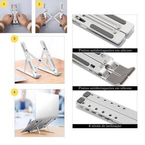 Suporte base de apoio para Notebook, Laptop, Tablet, etc. Portátil e ajustável 6 níveis. O suporte é produzido em liga de alumínio, é Firme e não fica balançando, possui regulagem de altura em 6 posições permitindo Que a tela fique na posição ideal de acordo com sua necessidade. Atende a norma regulamentadora NR 17. É dobrável, ajustável e de fácil transporte. Melhora a ventilação, mantém seu Aparelho na temperatura ideal sem a necessidade de cooler pois evita o super Aquecimento. É armazenado na capa de proteção que Acompanha o produto e possui apoio duplo frontal para evitar quedas. Mantém acesso a todas portas Frontais, laterais e traseira. Principais características: - Prático e portátil - Permite vários ângulos de trabalho até 6 Níveis de ajuste - Apoio duplo frontal para evitar deslizamento Do notebook - Não ocupa porta USB e outras - Mantém a temperatura de trabalho evitando Super aquecimento Material: Liga de alumínio, silicone e metal. Dados Técnicos: - Dimensões Aberto: AxLxP 15 x 18 x 25 cm - Dimensões Fechado: AxLxP 1,5x 4,5 x 25 cm - Aprox. 260 gramas Conteúdo da embalagem: 1 suporte para laptop 1 Capa de armazenamento de tecido TNT. Imagens meramente Ilustrativas ==================================== de 90 dias para defeitos de fabricação ==================================== Marca: Não Informado