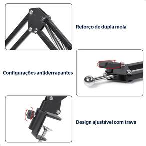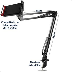 Dimensões do produto: Braço: 2 partes de 35cm de comprimento de cada lado Base: 6cm de comprimento Comprimento máximo total: Aproximadamente 78cm Abertura máxima da base: 4,5cm Abertura do suporte de tablet/celular: Mínimo 10cm, máximo 18cm Peso do produto: 535g