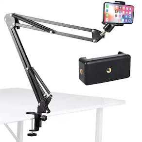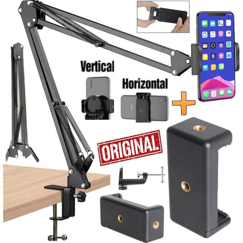 Suporte braço articulado de mesa celular smartphone garra apoio horizontal vertical foto vídeo selfie podcast escritório