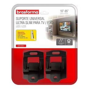 Suporte brasforma sbrub851 universal ultra slim televisão Marca - suporte de tv: brasforma Modelo - suporte de tv: sbrub851 Lugares de montagem - suporte de tv: parede O suporte fixo universal da brasforma proporciona uma visão frontal, é fácil de instalar, permite engate rápido e é indicado para tv led, lcd, plasma, 3d e smart tv de 10 a 85 polegadas. Possui trava de segurança, dispositivo basculante para fácil manuseio dos cabos. Acompanha parafusos e buchas para painel de madeira. É o acessório ideal para você que deseja espaço e organização na sua casa. Suporta até 100kg e você pode instalar com praticidade sua tv na parede. Fácil de instalar O padrão vesa padronizado permite que você saiba a distância entre os orifícios na parte traseira da tela, para que você possa escolher a montagem que melhor se adapta a esse tamanho. Este produto tem uma montagem variada para que você possa colocá-lo com segurança. Características: -marca: brasforma -modelo: sbrub851 - suporte universal -atende a maioria das tvs de lcd e led de 10 a 85 25cm - 216cm -ideal para visão frontal -carga máxima: 100 kg -2 pontos para fixação entre a tv e o suporte -desenvolvido em aço carbono de altíssima resistência -engate rápido -trava de segurança -fácil manuseio dos cabos -distancia da parede: 3 cm Conteúdo da embalagem: -suporte universal -manual e gabarito para montagem -jogo de parafusos para instalação em parede ou em painel de madeira -parafusos para tv m6 x 20mm; m8 x 20mm Observações: - verifique se a superfície de instalação apresenta resistência suficiente para uma instalação segura. -fique atenta para a carga máxima indicado para o suporte. - aconselhamos que a instalação seja realizada por um da área. - verifique se a furação da sua tv é compatível com o suporte. Imagens meramente ilustrativas