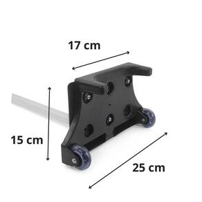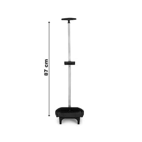 Capacidade : Modelo 45 cm ( indicada para mochilas/ mala com 43 a 47 cm de altura ), 50 cm ( 48 a 52 cm ) Altura da haste : esticada o suporte ficará com 90 cm Material: Haste de alumínio e base PVC rígido, rodinhas de silicone Indicação: Adultos e juvenis. Peso do produto: 450 gramas