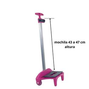 Capacidade : Modelo 45 cm ( indicada para mochilas/ mala com 43 a 47 cm de altura ), 50 cm ( 48 a 52 cm ) Altura da haste : esticada o suporte ficará com 90 cm Material: Haste de alumínio e base PVC rígido, rodinhas de silicone Indicação: Adultos e juvenis. Peso do produto: 450 gramas