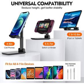 Suporte de celular ajustável, suporte de telefone celular dobrável para mesa, suporte compatível -KP-SP200 - EX-1011 O suporte de celular serve para todos os telefones de 4 a 7 polegadas,. Observação: A largura do gancho é de 1,2 cm, certifique-se de que a espessura do seu dispositivo com uma capa no total não seja maior do que 1,2 cm. altura e ângulo ajustáveisO suporte de telefone é ajustável na altura e ângulo. Dois ângulos ajustáveis livres de 135º e 2 níveis de altura ajustáveis de 115-148 mm. Você pode facilmente ajustá-lo para um ângulo de visualização ideal e liberar suas mãos quando estiver comendo, assistindo vídeos, jogando jogos ou fazendo chamadas de vídeo. A característica totalmente dobrável facilita o transporte. base estável e almofada de silicone antiderrapante Uma haste de suporte de liga de alumínio com uma base pesada reforça a estabilidade do suporte do telefone para evitar agitações. Almofada de silicone totalmente coberta na parte inferior e suporte para evitar que deslize e proteja seu telefone contra arranhões. dobrável e portátilTamanho compacto e design totalmente dobrável tornam este suporte de iPhone um acessório perfeito para viajar, você pode facilmente colocá-lo em seus bolsos, bolsas ou mochilas. serviço de qualidade eficienteO suporte de mesa para iPhone vem com um atendimento ao cliente 100% satisfeito sem preocupações. Ean: 7892021113806