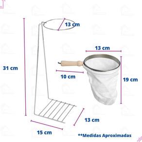 Com medidas de 13 cm de diâmetro, 31 cm de altura e 15 cm de largura, o suporte é ideal para qualquer cantinho do café. O coador possui 13 cm de diâmetro, 19 cm de comprimento e o cabo de madeira tem 10 cm de comprimento.
