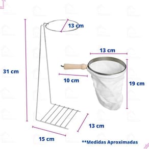 Com medidas de 13 cm de diâmetro, 31 cm de altura e 15 cm de largura, o suporte é ideal para qualquer cantinho do café. O coador possui 13 cm de diâmetro, 19 cm de comprimento e o cabo de madeira tem 10 cm de comprimento.