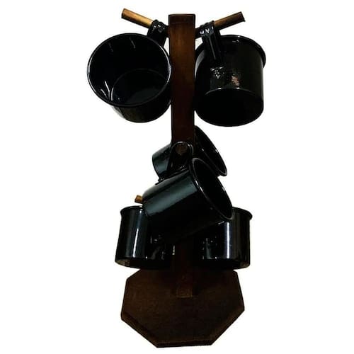 Suporte rústico com 6 canecas de café em alumínio esmaltadas - black Suporte organizador em madeira rústica com 6 canecas de café em alumínio esmaltadas décor Suporte organizador em madeira rústica com 6 canecas de café em alumínio esmaltados décor. Canecas em alumínio esmaltadas com suporte em madeira rústica para tomar aquele cafezinho ou água com sabor de velha infância, estilo retrô - vintage. Surpreenda suas visitas com este lindo suporte organizador rústico de canecas / copos e/ou xícaras em cerâmica/porcelana. Ótimo suporte decorativo feito em madeira rústica e canecas em alumínio com pintura eletrostática alto brilhante e de alta qualidade com acabamento perfeito, além de ser uma ótima opção para presentear.Dimensões:- suporte de canecas amadeirado: altura: 30 cm x largura: 13 cm- canecas em alumínio esmaltadas: altura:6 cm x largura:6,5 cm x comprimento:8 cmCapacidade: 80 ml Características do produto:- caneca em alumínio em alumínio anodizado com pintura eletrostática;- produzido por artesões profissionais seguindo um padrão de qualidade que atenda o gosto dos nossos clientesCuidados:- recomendamos o uso de pano levemente umedecido para sua limpeza.Garantia do produto:- o produto é muito bem acomodado dentro da caixa, e super embalado para evitar quebras, ainda assim possuímos um sistema de garantia e troca.Imagens meramente ilustrativas - produto artesanal, podendo variar de cor e/ou tonalidade Marca: Retrofenna Decor