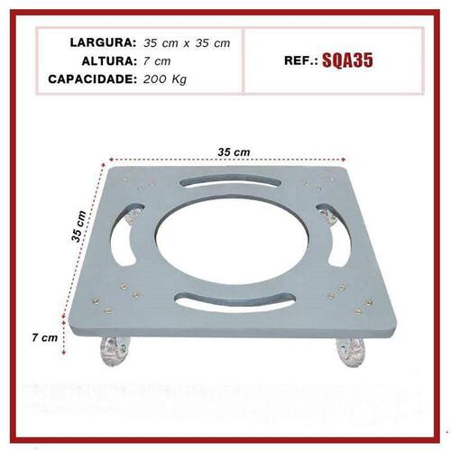 Suporte De Alumínio Com Rodízios Gel Para Vaso Quadrado 35CmSuporte de alumínio Quadrado com rodinhas de silicone gel anti-risco e anti ruido.Ideal para facilitar a locomoção de objetos em geral, como vasos de plantas, eletrônicos, eletrodomésticos, entre outros.Em qualquer ambiente, sem ruídos e sem riscar ou danificar o seu piso4 rodízios giratórios - suportam até 200 kg.Modelo SQA35Medidas técnicas do suporte: Altura total: 7 cm; Largura da base: 35x35 cm;Medidas técnicas do rodízio:Contém 4 rodasDiâmetro da roda: 50 mm;Vantagens:· grande durabilidade e resistência;· não enferrujam;· não riscam;· antirruídos;· suportam grande quantidade de peso