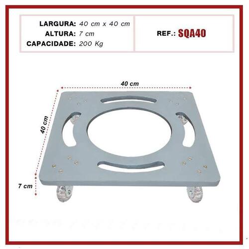 Suporte De Alumínio Com Rodízios Gel Para Vaso Quadrado 40Cm Suporte de alumínio Grande Quadrado com rodinhas de silicone gel anti-risco e anti ruido. Ideal para facilitar a locomoção de objetos em geral, como vasos de plantas, eletrônicos, eletrodomésticos, entre outros. Em qualquer ambiente, sem ruídos e sem riscar ou danificar o seu piso. 4 rodízios giratórios - suportam até 200 kg. Modelo SQA40 Medidas técnicas do suporte: Altura total: 7 cm; Largura da base: 40x40 cm; Medidas técnicas do rodízio: Contém 4 rodas Diâmetro da roda: 50 mm; Vantagens: · grande durabilidade e resistência; · não enferrujam; · não riscam; · antirruídos; · suportam grande quantidade de peso Ean: 7898679670739
