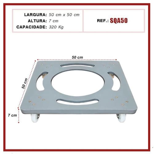 Suporte De Alumínio Quadrado Com Rodízios Gel Para Vaso 50Cm Suporte de alumínio Quadrado com rodinhas de silicone gel anti-risco e anti ruido. Ideal para facilitar a locomoção de objetos em geral, como vasos de plantas, eletrônicos, eletrodomésticos, entre outros. Em qualquer ambiente, sem ruídos e sem riscar ou danificar o seu piso 4 rodízios giratórios - suportam até 320kg Modelo SQA50 Medidas técnicas do suporte: Altura total: 7 cm; Largura da base: 50x50 cm; Medidas técnicas do rodízio: Contém 4 rodas Diâmetro da roda: 50 mm; Vantagens: · grande durabilidade e resistência; · não enferrujam; · não riscam; · antirruídos; · suportam grande quantidade de peso Ean: 7898679670753