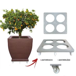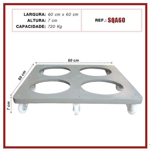 Suporte de alumínio Quadrado com rodinhas de nylon anti-risco e anti ruido. Ideal para facilitar a locomoção de objetos em geral, como vasos de plantas, eletrônicos, eletrodomésticos, entre outros. Em qualquer ambiente, sem ruídos e sem riscar ou danificar o seu piso 9 rodízios giratórios - suportam até 720 kg Modelo SQA60 Medidas técnicas do suporte: Altura total: 7 cm; Largura da base: 60x60 cm; Medidas técnicas do rodízio: Contém 9 rodas; Diâmetro da roda: 50 mm; Vantagens: · grande durabilidade e resistência; · não enferrujam; · não riscam; · antirruídos; · suportam grande quantidade de peso;