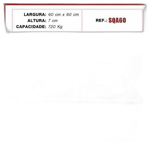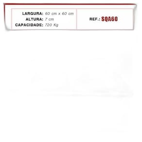 Suporte de alumínio Quadrado com rodinhas de nylon anti-risco e anti ruido. Ideal para facilitar a locomoção de objetos em geral, como vasos de plantas, eletrônicos, eletrodomésticos, entre outros. Em qualquer ambiente, sem ruídos e sem riscar ou danificar o seu piso 9 rodízios giratórios - suportam até 720 kg Modelo SQA60 Medidas técnicas do suporte: Altura total: 7 cm; Largura da base: 60x60 cm; Medidas técnicas do rodízio: Contém 9 rodas; Diâmetro da roda: 50 mm; Vantagens: · grande durabilidade e resistência; · não enferrujam; · não riscam; · antirruídos; · suportam grande quantidade de peso; Ean: 7898679670760