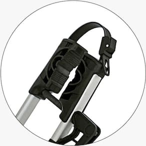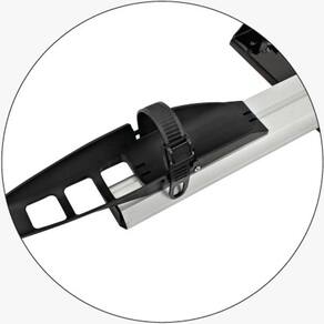 Trilho largo e longo em alumínio e cintas de fixação do pneu ao suporte extra grandes (43cm de comprimento). Aconselhável para aros 29, principalmente de quadros grandes.