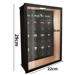 Dimensões: Comprimento: 28 cm; Largura: 21 cm; Profundidade:5 cm; Texto ao fundo: Wine is always the answer Vinho é sempre a resposta ; Imagem: Tipos de Vinhos; Película transparente em PET, não trinca ou amarela como o acrílico; Produto entregue já montado; Corte à Laser - Extrema Qualidade e Acabamento; Fabricado com 100% madeira de reflorestamento; Fixação por parafuso ou fita dupla face Estes itens não acompanham o produto ; Estampa impressa em Adesivo de Alta Resistência;