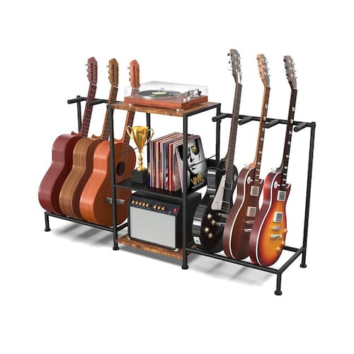 - Com uma estrutura espaçosa de 53,1” L x 12,8” L x 27” H, este suporte de guitarra de 3 camadas oferece amplo armazenamento organizado. A prateleira de malha intermediária contém perfeitamente toca-discos de vinil, álbuns, discos e partituras. Mantenha suas coleções de guitarra e áudio seguras em um rack que economiza espaço.