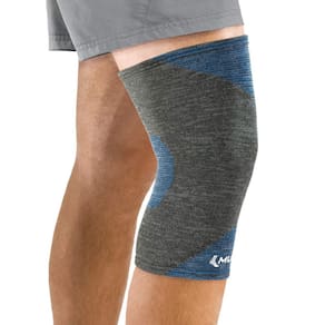 MUELLER Suporte de joelho elástico de 4 vias FIR de medicina esportiva, alívio da dor no joelho para homens e mulheres, ideal para artrite, entorses, cinza/azul, médio/grande