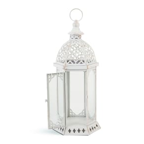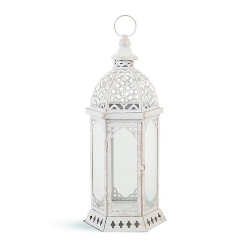 - A lanterna pesa 1 kg. e mede 17 x 15 x 40 cm com moldura de ferro e acabamento branco envelhecido estilo vintage com painéis de vidro transparente que permitem que a luz da sua vela favorita brilhe