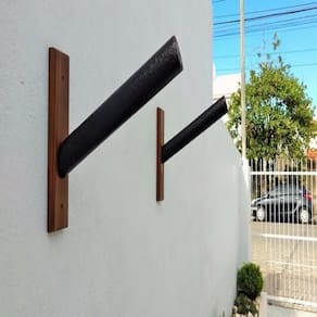 Suporte De Madeira Para 1 Prancha Ainda não arrumou o local ideal para guardar as pranchas Nosso suporte em madeira envernizada é ideal para até três pranchas de até 5 kg cada. As barras revestidas com espuma servem para proteger as pranchas contra pancadas, garantindo uma total proteção. Suporte em madeira para 1 prancha Angulo de 45 graus Espuma para proteção Madeira com pintura tinta Osmocolor Madeira maciça de reflorestamento, Pinus Elliottii, com tratamento em altoclave Possui 15 anos de contra cupins, fungos e é resistente à umidade. Acabamento pintura em Stain Impregnante, a base d'água. A espuma de polietileno expandido dá maior proteção para sua prancha. A base que que é fixada na parede mede 7,5 de largura por 2 de espessura por 60 de comprimento A hastes tem inclinação de 45 graus e mede 39 centímetros e com a espuma tem o total de 5 cm de diâmetro. Acompanha parafusos e buchas Não acompanha prancha