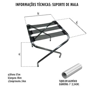 Suporte para malas dobrável é prático e comporta diversas malas, tendo capacidade de 100kg. Deixa o ambiente organizado e mais bonito. Fabricado em alumínio, possui alta resistência e durabiliade. Ótimo para locais como hotel e apartamento.