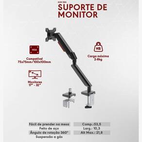 Atributos e Benefícios - Compatível com monitores de 17” a 32”: Suporta uma ampla faixa de tamanhos. - Capacidade de até 8 kg: Suporta monitores robustos com segurança e estabilidade. - Padrão VESA (75x75mm e 100x100mm): Compatível com a maioria dos modelos do mercado. - Totalmente articulado: Braços com rotação de 360°, inclinação de -90° a +45° e ajuste de altura, oferecendo ergonomia e conforto visual. - Instalação por fixação de mesa: Fácil de instalar, ocupa pouco espaço e mantém a área de trabalho organizada. - Material resistente: Fabricado em polietileno de alta durabilidade, com acabamento na cor preta elegante e discreta. - Organização e produtividade: Permite posicionar o monitor conforme a necessidade do usuário, melhorando a postura e o foco no trabalho. - Design moderno e funcional: Ideal para escritórios, home offices e ambientes gamer.