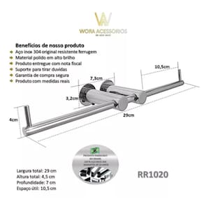 Características: ? Material Premium: Aço Inox 304 Polido — durável, higiênico e resistente à corrosão. ? Design Funcional: Suporte duplo que permite o uso contínuo sem necessidade de reposição imediata. ? Estilo Moderno: Acabamento em alto brilho que traz sofisticação ao ambiente. ? Instalação Simples: Acompanha kit completo de fixação e manual de instalação. ? Fixação Segura: Estrutura firme e confiável, mesmo em uso frequente. ? Uso Versátil: Ideal para banheiros residenciais, lavabos e estabelecimentos comerciais. ? Tamanho Compacto: Design inteligente que se adapta a diferentes espaços. ? Garantia de 5 Anos.