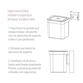 Veja como é fácil instalar o suporte e encaixar a lixeira nele: 1-faça furos na parede que deseja instalar, de acordo com as aberturas do suporte e fixe-o com os parafusos. 2-encaixe sua lixeira na estrutura do suporte. 3-certifique-se de que a lixeira está fixada totalmente. Pronto, o produto já pode ser utilizado com segurança.