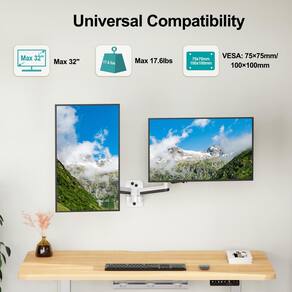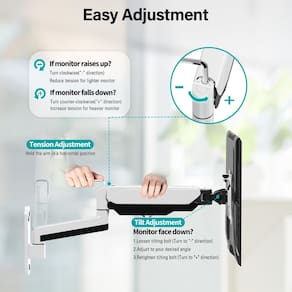 Tamanho: Suporte de parede com monitor duplo Especificações do produto: 1. Material: aço pesado e alumínio 2. Faixa de altura ajustável: 11 polegadas 3. Inclinação: +90 ~ -45 graus 4. Giratório: +90 ~ -90 graus 5. Rotação: +180 ~ -180 graus 6. Extensão máxima de 19,3 polegadas NOTA: Este suporte de montagem em monitor de computador só serve para monitores que possuem as três especificações a seguir ao mesmo tempo: 1. Tamanho da tela: até 32" 2. Capacidade de peso: 2,2 libras a 17,6 libras 3. Deve ter orifícios de montagem VESA e o padrão VESA é 75x75mm ou 100x100mm. Características principais Full Motion O braço articulado oferece inclinação de +90° a -45°, rotação de 180° e rotação de 360°. Ele pode ser estendido até 19,3” perto da parede. O monitor pode ser colocado em formato retrato ou paisagem, é fácil compartilhar telas com outras pessoas por meio da função giratória. Ajuste da altura do contrapeso A mola a gás de contrapeso interna se ajusta ao peso do monitor, criando um efeito de flutuação livre suspenso que permite ajustar instantaneamente a altura do monitor sem o uso de ferramentas. Gerenciamento integrado de cabos O sistema integrado de gerenciamento de cabos facilmente removível ajuda a manter os cabos AV e de alimentação fora da vista e organizados. Permita que os fios se movam livremente enquanto muda as posições da tela e mantenha o cabo bem organizado. Dois métodos de instalação OPÇÃO A: Instalação de pinos de madeira. Ao instalar na parede de vigas de madeira, não use uma âncora em drywall ou madeira. OPÇÃO B: Instalação de parede de concreto sólido. Ao instalar este suporte de monitor na parede de concreto sólido, é necessária a âncora fornecida. - Ajustes de movimento total - O monitor duplo ajustável de montagem na parede oferece inclinações de +90° a -45°, rotação de 180° e rotação de 360°. O braço do monitor pode ser estendido até 19,04", o que oferece um ângulo de visão mais ideal e ajuda a reduzir a dor no pescoço, ombros e costas. - Ampla compatibilidade - Este suporte de parede para monitor duplo é adequado para telas de computador de 13 15 17 17 19 20 22 23 24 27 30 32 polegadas com padrões VESA de 75 x 75 mm ou 100 x 100 mm. Cada braço de monitor de parede comporta 2,2-17,6 libras. - Libere espaço na sua mesa - Este suporte de parede para monitor duplo mantém seu monitor na parede e libera muito espaço valioso em sua mesa. O sistema integrado de gerenciamento de cabos facilmente removível ajuda a manter os cabos AV e de alimentação fora da vista e organizados. - Sistema de mola a gás mais avançado - Este monitor é montado na parede para 2 monitores e foi construído para milhares de movimentos, passando por testes de 10.000 ciclos, que alcançam flexibilidade e estabilidade do que a mola mecânica tradicional. Ele pode ser ajustado ao peso do seu monitor, criando um efeito de flutuação livre suspenso. Ajuste-o de acordo com o peso do monitor antes de usar. - Fácil montagem - Este suporte de monitor de parede duplo se encaixa tanto em vigas de madeira quanto em paredes de concreto sólido. Observe que não instale apenas no drywall. Ao instalar este suporte VESA do monitor na parede de vigas de madeira, não use a âncora em drywall ou madeira. Ao instalar na parede de concreto sólido, a âncora fornecida é necessária. Vem com todo o hardware e instruções necessários, este suporte de monitor de parede pode ser instalado em 10 minutos.