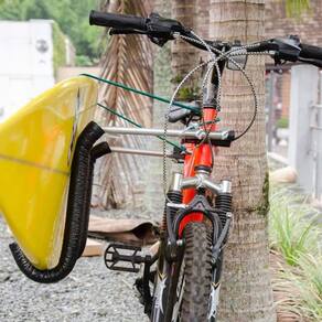 Suporte para transportar prancha de surf em sua bike, trazendo praticidade no transporte do seu surfboard na bike.