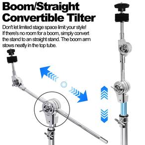 - Inclinação conversível em lança/reta: cada suporte de prato pode ser utilizado de duas maneiras: lança e reta. A lança é montada em um tubo vertical para facilitar o ajuste do comprimento, ou remova-a e incline a braçadeira da lança para posicionar a lança na posição desejada. Não deixe que o espaço limitado do palco limite seu estilo!