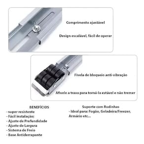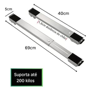 Esse suporte é ajustável, podendo ser utilizado em eletrodomésticos e móveis de diferentes tamanhos. Ele possui travas que garantem a segurança na hora de mover o aparelho e é feito de aço resistente e reforçado, suportando até 200kg.