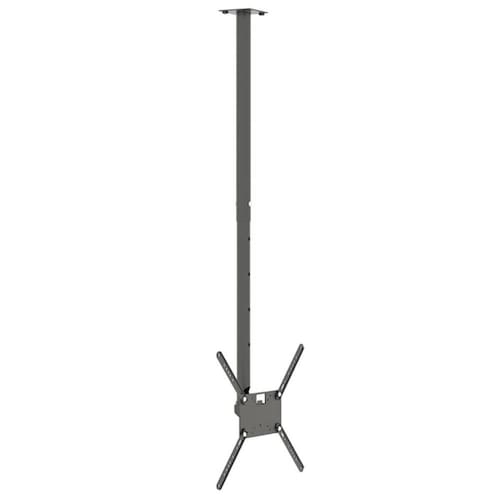 Suporte de teto com inclinação para TVs de tela fina de 19” a 56”. Possui passagem interna para os cabos e oferece giro de até 360º para o televisor. A altura é regulável de 75,0 até 115,0 cm do local de fixação até o centro da TV. O sistema de encaixe da TV no suporte facilita e permite que a instalação seja realizada por apenas uma pessoa com facilidade, além de oferecer 3 níveis diferentes de inclinação: 0°, 6° ou 15°.
