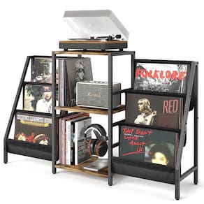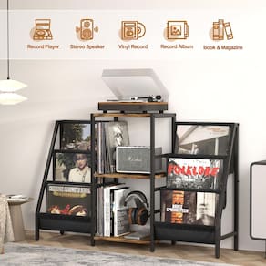 - ?Suporte para toca-discos de maior capacidade?Com prateleiras espaçosas de 3 camadas e 2 suportes de exibição de vinil, a capacidade de armazenamento da mesa do toca-discos é o dobro de outras. Oferece um local elegante para reproduzir/organizar seus toca-discos, alto-falantes, discos, livros, revistas, álbuns, equipamentos de mídia e muito mais.