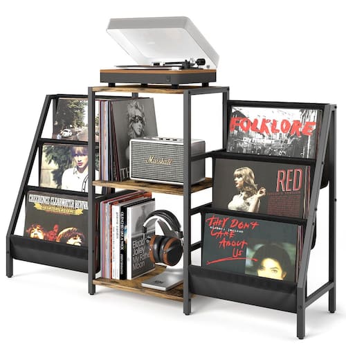 O suporte para toca-discos de vinil Tewinko com armazenamento possui um design requintado de meados do século. É simples e tem um design muito clássico e neutro, complementando a maioria dos espaços internos. Ele também tem mais de duas vezes espaço do que outros para colocar o toca-discos e discos de vinil. Prateleira resistente de 3 camadas e 2 suportes de gravação laterais resistentes oferecem espaço expansivo. A mesa do toca-discos é de alta qualidade e construída para durar com a moldura de metal espessa, placa de madeira durável e tecido oxford de alta qualidade.