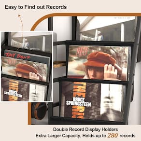 - ?Suporte para toca-discos com 2 suportes de discos?Dois elegantes suportes de armazenamento para exibição de discos têm espaços de armazenamento de prateleira de vinil totalmente de 6 níveis. Todo o suporte de discos pode conter mais de 200 discos. É conveniente descobrir registros e oferece uma experiência de navegação que parece que você está em uma loja de discos.