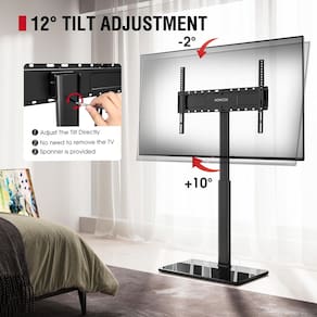 - Ajuste de inclinação giratório atualizado: este suporte giratório de TV permite que você gire sua tela 25° para a esquerda ou direita para apontar para qualquer lugar da sala. A função de inclinação de -2°-10° permite nivelar sua TV, e vale a pena mencionar que atualizamos o ajuste de inclinação para que você possa ajustar facilmente o ângulo simplesmente girando os parafusos longos na parte traseira do suporte de TV alto