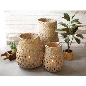 Conjunto de lanternas de vela MY SWANKY HOME Tropical Natural Woven Bamboo Pillar Three Glass Hurricane — inclui três lanternas, uma de cada tamanho mostrado. O tamanho grande mede 14" d x 20,5” t.
