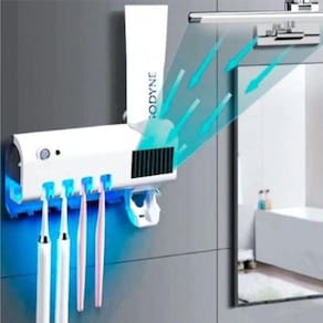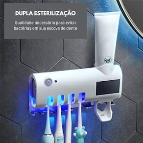 Suporte Dispenser Automático de Pasta de Dente com Esterilizador UV Suporte Dispenser Automático para Escovas e Pasta de Dente com Esterilizador UV O porta escova de dentes solar possui uma tecnologia avançada, contendo o raio ultravioleta e foto catalisador que agiliza a esterilização eletrônica, matando 99,9% das bactérias e micro-organismos que causam danos nas escovas de dente e na saúde bucal. A bomba de vácuo libera o creme dental em uma quantidade adequada, evitando desperdício. O dispenser tem um sistema de carregamento solar e iluminação doméstica, não sendo necessário plugues e baterias para substituir, que garante segurança e economia. ESPECIFICAÇÕES TÉCNICAS: Medidas: largura 19,2 cm x comprimento 5 cm x Altura 13,5 cm Cores disponíveis: Preto e Branco Material: ABS Entrada: Bivolt 100-240 v 50/60 hz 1 Dica: Use USB para carregar por 6 horas antes do primeiro uso; 2 Dica: Faça uma marcação na sua parede antes de instalar o produto para uma melhor visualização do local; 3 Dica: Para instalar basta remover a fita dupla-face, pressionar 3 vezes, e colocar o selante em torno dele; 4 Dica: Sem necessidade de ativação manual, o sensor inteligente ativo quando uma pessoa se aproxima e começa a esterilizar depois de sair.