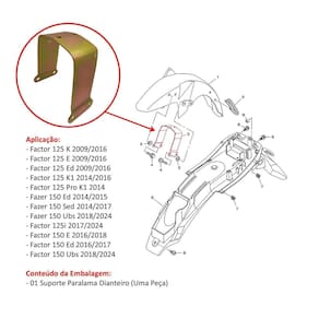 Suporte Do Paralama Dianteiro Ybr Factor 125/150 Fazer 150 Aplicação: - Factor 125 K 2009/2016 - Factor 125 E 2009/2016 - Factor 125 Ed 2009/2016 - Factor 125 K1 2014/2016 - Factor 125 Pro K1 2014 - Fazer 150 Ed 2014/2015 - Fazer 150 Sed 2014/2017 - Fazer 150 Ubs 2018/2024 - Factor 125i 2017/2024 - Factor 150 E 2016/2018 - Factor 150 Ed 2016/2017 - Factor 150 Ubs 2018/2024 Conteúdo da Embalagem: - 01 Suporte Paralama Dianteiro Uma Peça Características e benefícios: - O suporte do paralama dianteiro serve para fixar o paralama na motocicleta, protegendo o piloto e a moto de detritos, lama e água lançados pela roda dianteira durante a condução. - Ele também garante a segurança ao manter o paralama firmemente posicionado, evitando acidentes causados por peças soltas ou desalinhadas. Em mais detalhes, o suporte do paralama dianteiro: - Fixa o paralama: É a estrutura que sustenta e mantém o paralama preso à motocicleta, geralmente na região da roda dianteira. - Protege contra detritos: Impede que pedras, lama, água e outros objetos projetados pela roda atinjam o piloto, a moto e o motorista. - Melhora a segurança: Um suporte bem fixado garante que o paralama não se solte durante a condução, evitando acidentes e riscos. - Auxilia na estética: O suporte também contribui para o visual da motocicleta, mantendo o paralama na posição correta e alinhada. Marca: Não Informado Ean: 7898938811170