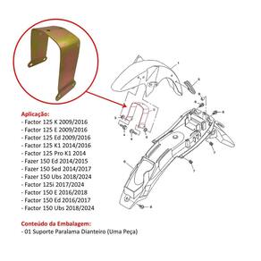 Suporte Do Paralama Dianteiro Ybr Factor 125/150 Fazer 150 Aplicação: - Factor 125 K 2009/2016 - Factor 125 E 2009/2016 - Factor 125 Ed 2009/2016 - Factor 125 K1 2014/2016 - Factor 125 Pro K1 2014 - Fazer 150 Ed 2014/2015 - Fazer 150 Sed 2014/2017 - Fazer 150 Ubs 2018/2024 - Factor 125i 2017/2024 - Factor 150 E 2016/2018 - Factor 150 Ed 2016/2017 - Factor 150 Ubs 2018/2024 Conteúdo da Embalagem: - 01 Suporte Paralama Dianteiro Uma Peça Características e benefícios: - O suporte do paralama dianteiro serve para fixar o paralama na motocicleta, protegendo o piloto e a moto de detritos, lama e água lançados pela roda dianteira durante a condução. - Ele também garante a segurança ao manter o paralama firmemente posicionado, evitando acidentes causados por peças soltas ou desalinhadas. Em mais detalhes, o suporte do paralama dianteiro: - Fixa o paralama: É a estrutura que sustenta e mantém o paralama preso à motocicleta, geralmente na região da roda dianteira. - Protege contra detritos: Impede que pedras, lama, água e outros objetos projetados pela roda atinjam o piloto, a moto e o motorista. - Melhora a segurança: Um suporte bem fixado garante que o paralama não se solte durante a condução, evitando acidentes e riscos. - Auxilia na estética: O suporte também contribui para o visual da motocicleta, mantendo o paralama na posição correta e alinhada. Marca: Não Informado