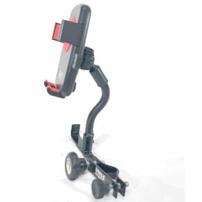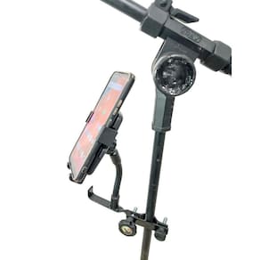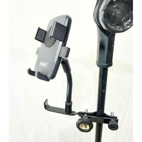 Suporte duplo de celular e pandeiro, todo fabricado em metal de alta resistência, pintura epóxi e de simples instalação desenvolvido por JC suportes para ser acoplado em pedestais de microfone padrão, compacto medindo somente 27x10x10 cm e pesando 257g na cor preto brilho, sendo transportado facilmente, Vai facilitar muito nos seus shows, festas, lives etc, e conta também com um suporte para o seu celular que tem uma haste flexível de fácil manipulação, acompanha manual de instruções e mini bag.