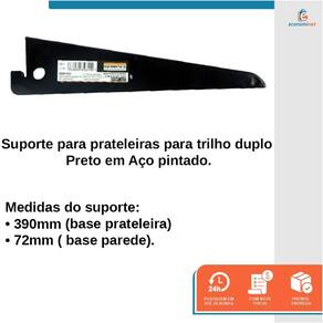 Suporte Trilho Duplo Preto 37cm - STARFERSuporte para prateleiras para trilho duplo preto em aço pintado.Medidas do suporte: 390mm (base prateleira) x 72mm (base parede). Indicado para fixar prateleiras com largura até 370mm.Embalagem: Caixa de papelão.Ref.: 13070830Marca: Starfer
