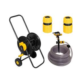 1 Suporte para mangueira com rodas, acompanha: 2 conectores 1/2" (fêmea), 1 conector principal (macho). Possui corpo em plástico ABS, manivela para acionamento, base e alça metálicas tubulares para transporte/apoio. Acompanha conectores macho para engate rápido 1/2". Fácil montagem, não necessita de ferramentas. Indicado para enrolamento de até 45 m de mangueira de jardim 1/2" (não acompanha mangueira).